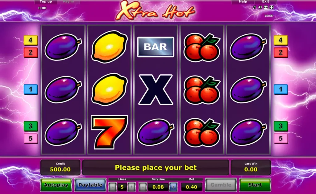 Слот Xtra Hot — это классический пятибарабанный игровой автомат с пятью фиксированными линиями выплат. Разработчиком этого слота является известная компания Novomatic, которая уже много лет радует игроков своими качественными и интересными играми. Главными символами в игре являются фрукты, звезды и семерки, а стиль и дизайн слота выполнены в яркой и сочной цветовой гамме, что придает игре особый шарм и привлекательность.